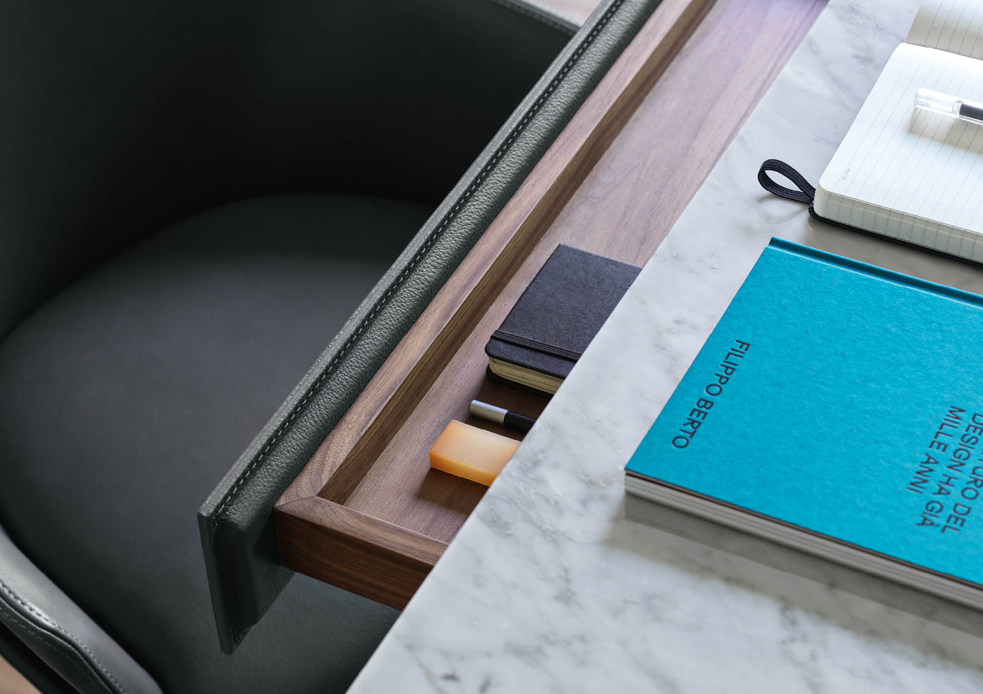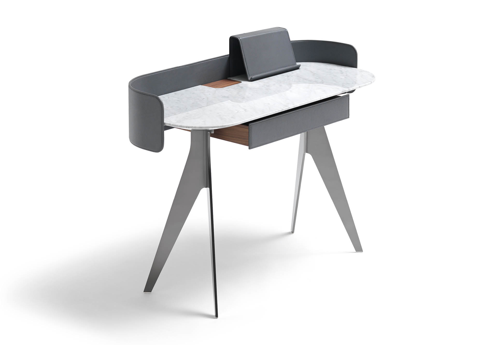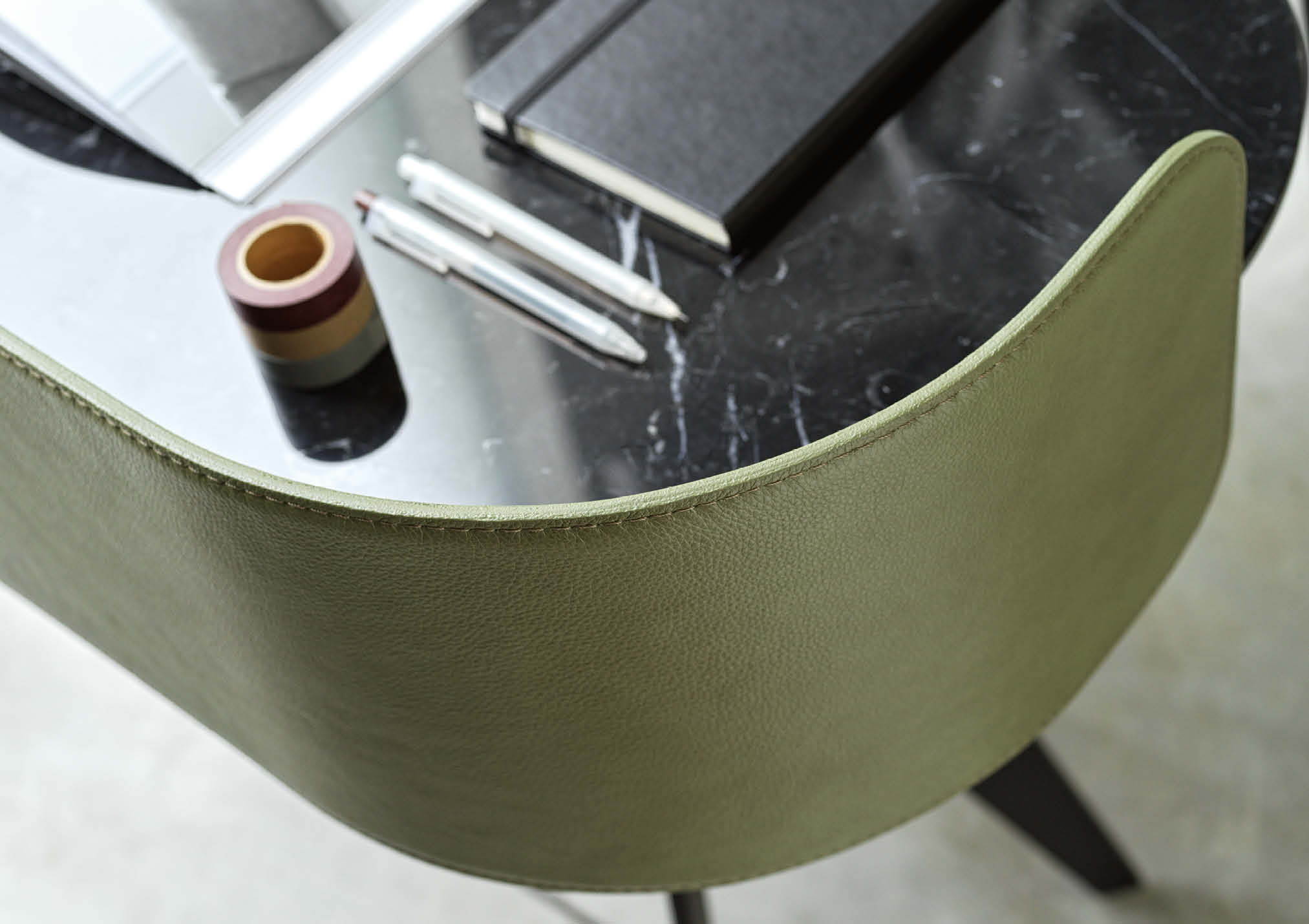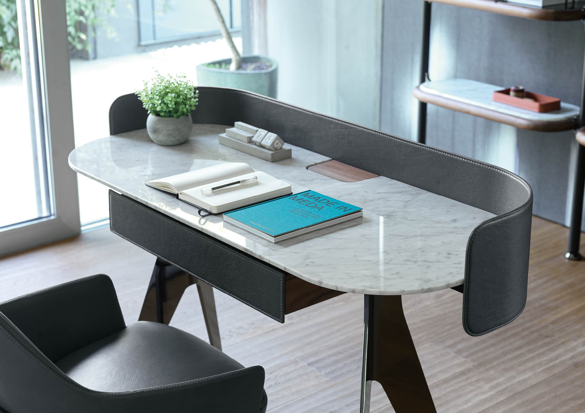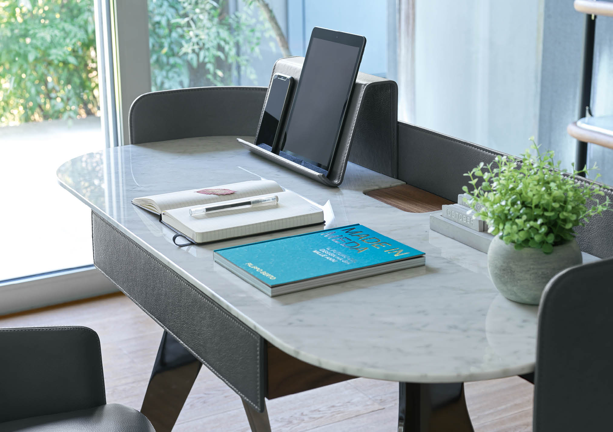 Covered in full-grain leather, free of sharp edges and pleasant to the touch and thanks to the support for an Ipad and Iphone, Jim organises the activity of a home office taking up very little space but achieving maximum functionality in every centimetre.