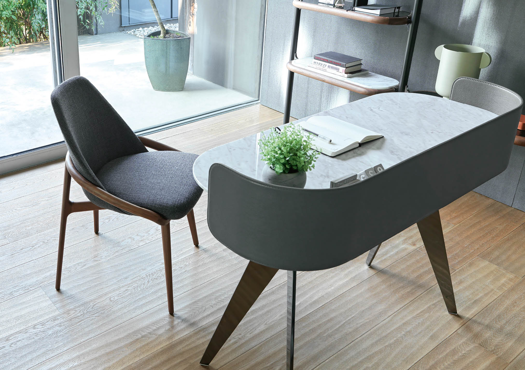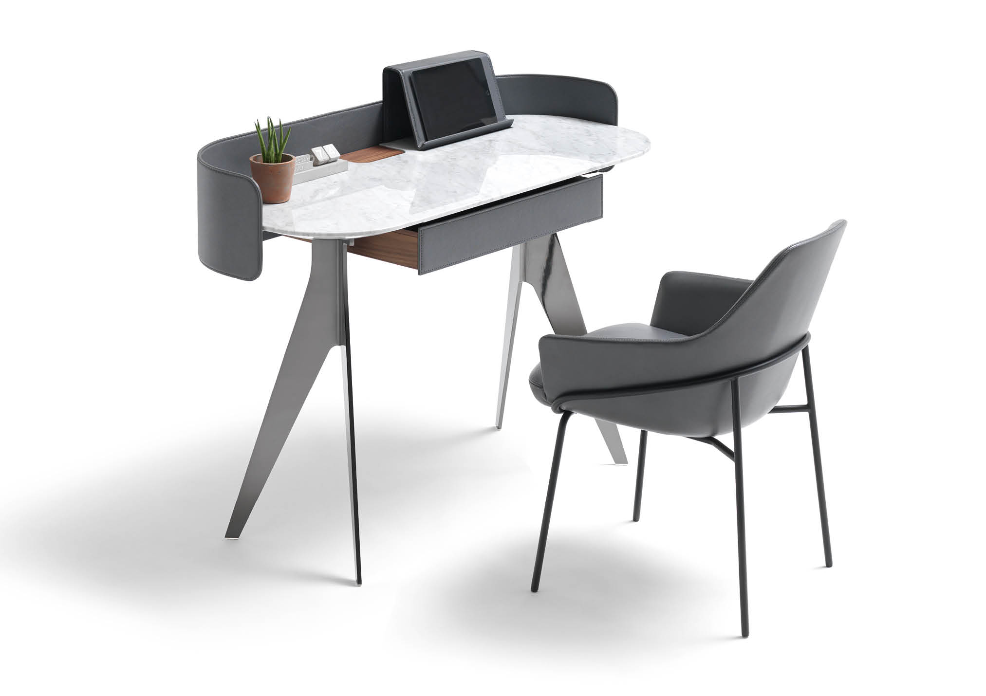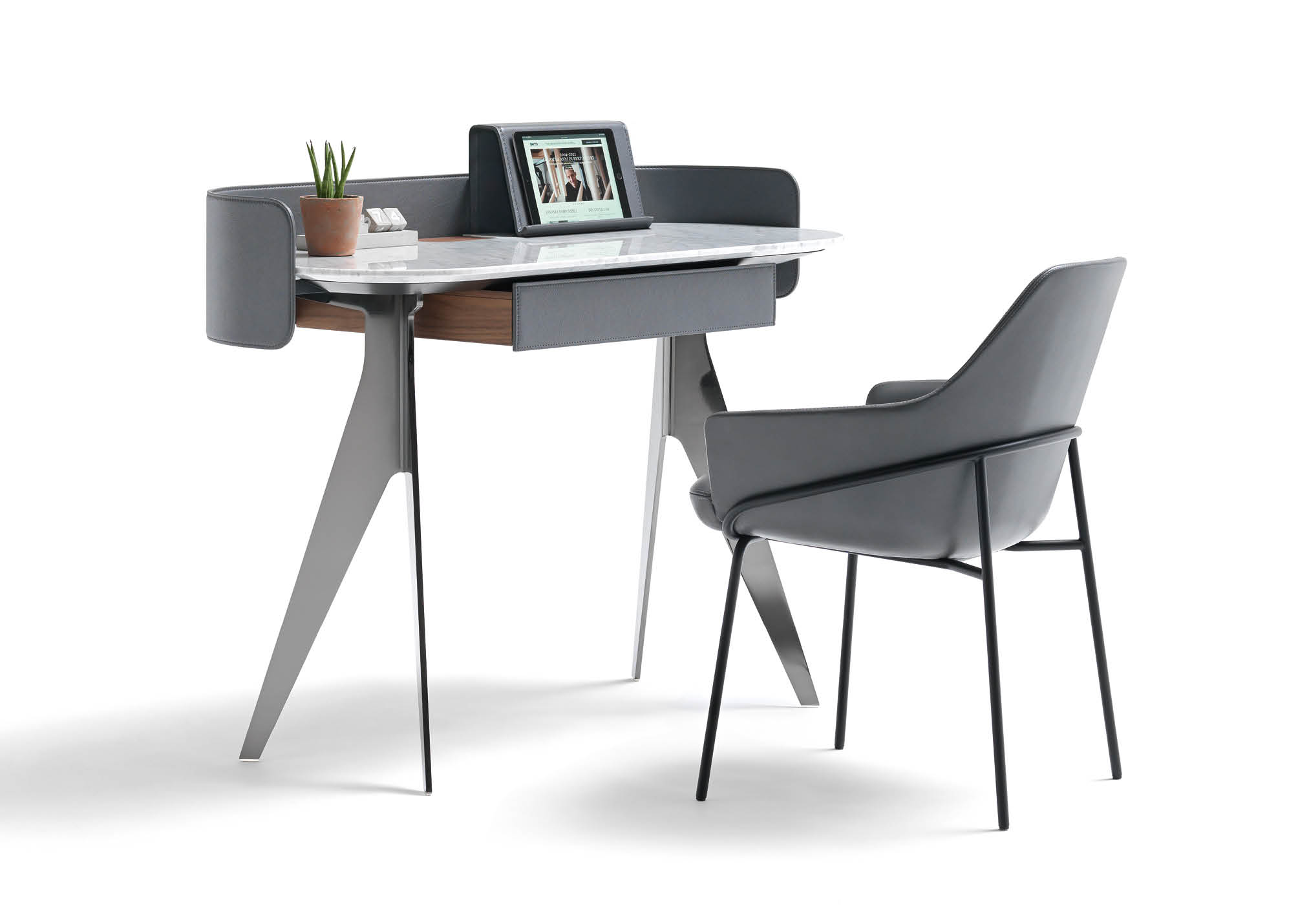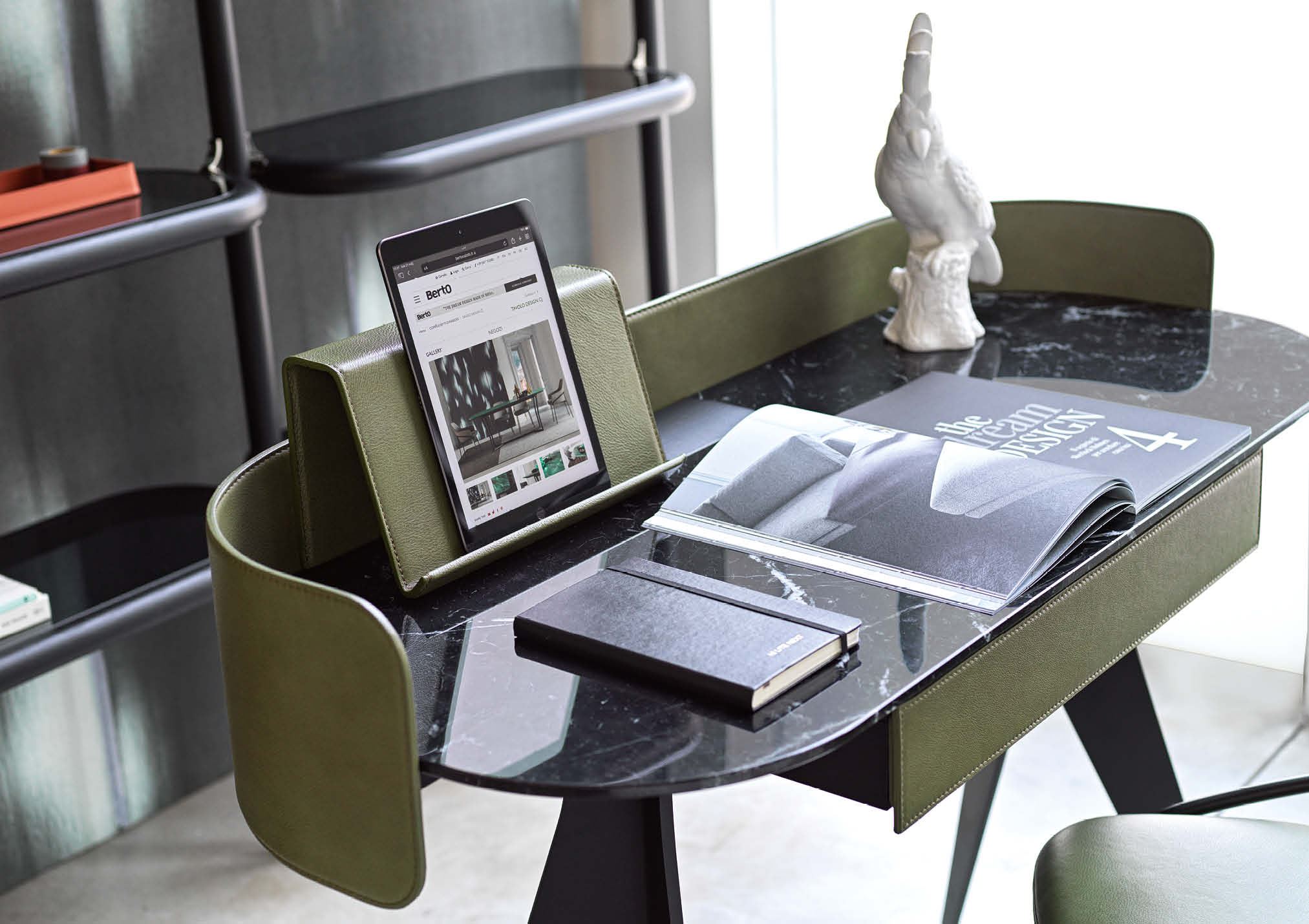 Covered in full-grain leather, free of sharp edges and pleasant to the touch and thanks to the support for an Ipad and Iphone, Jim organises the activity of a home office taking up very little space but achieving maximum functionality in every centimetre.