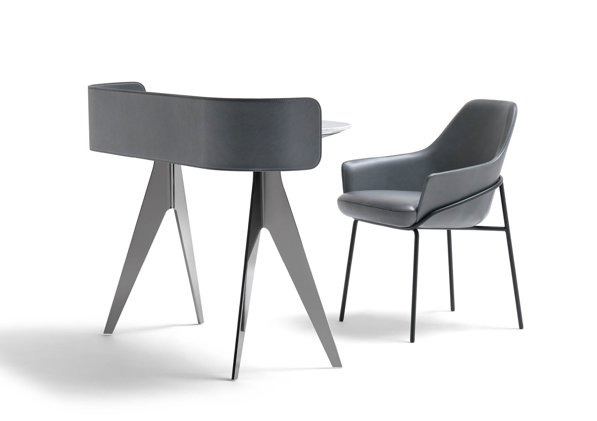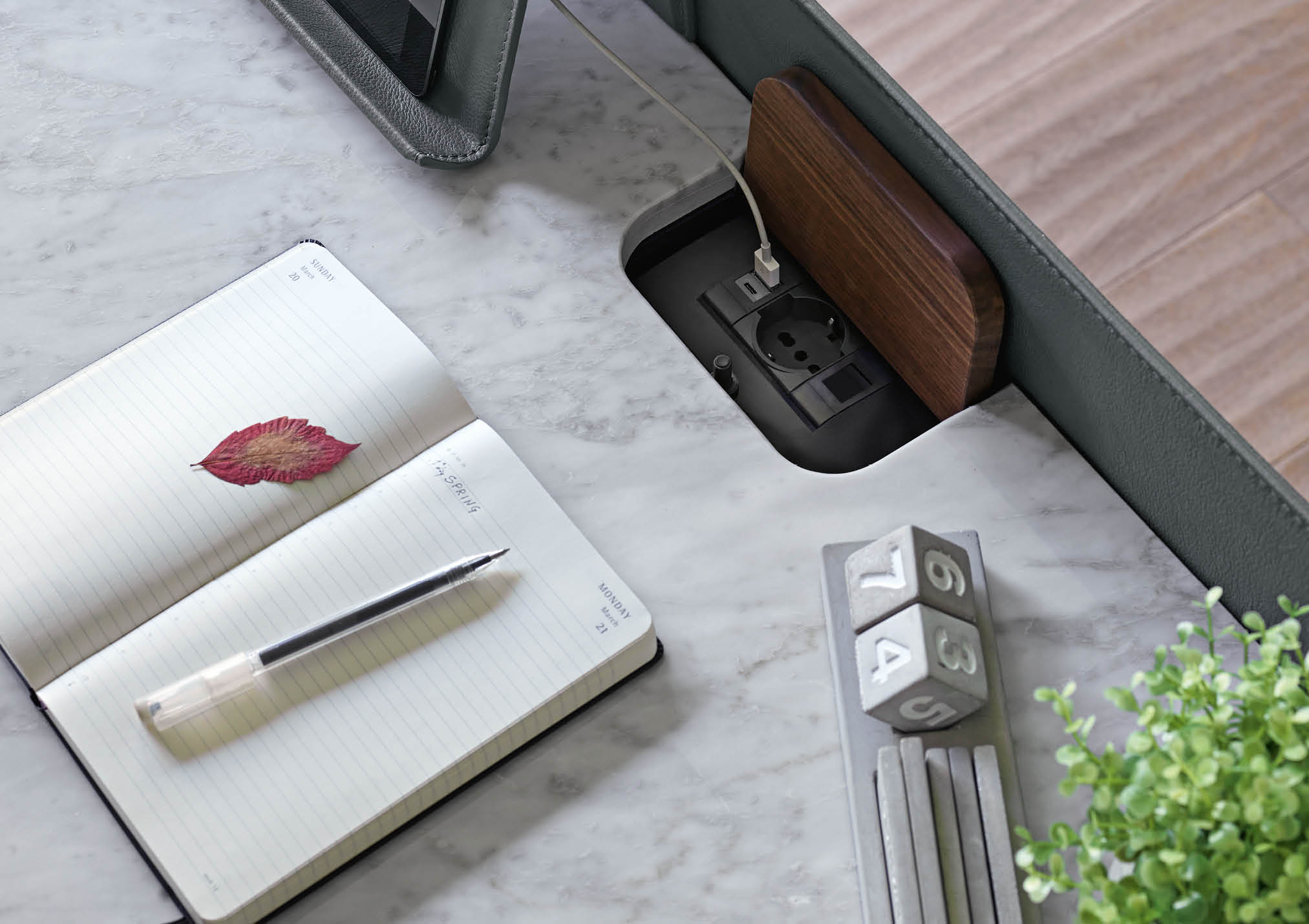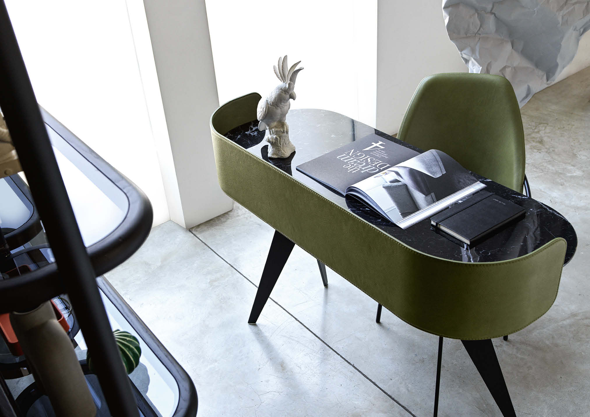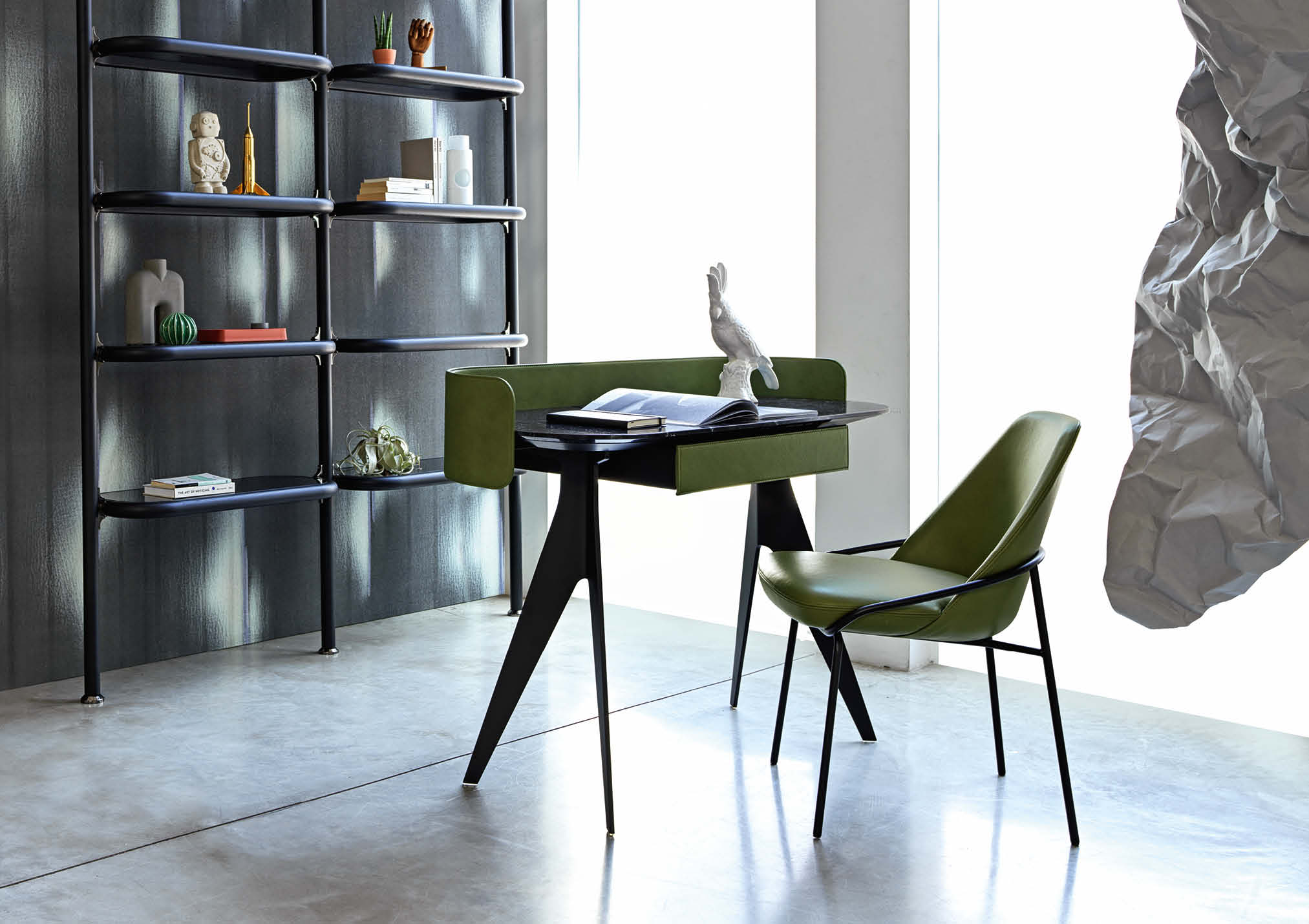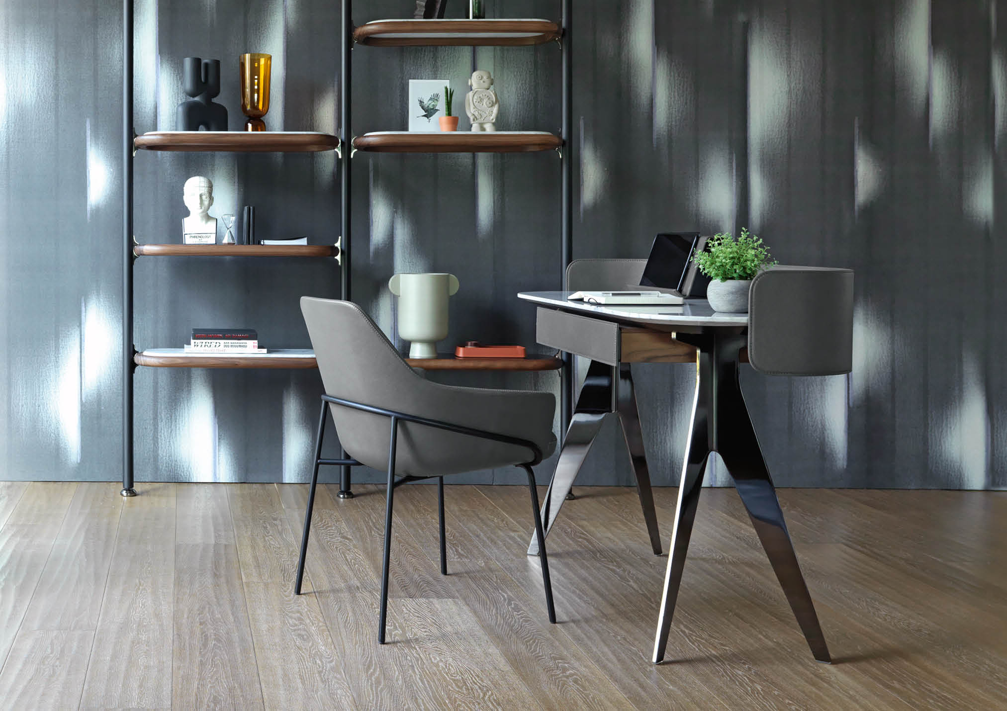 Covered in full-grain leather, free of sharp edges and pleasant to the touch and thanks to the support for an Ipad and Iphone, Jim organises the activity of a home office taking up very little space but achieving maximum functionality in every centimetre.