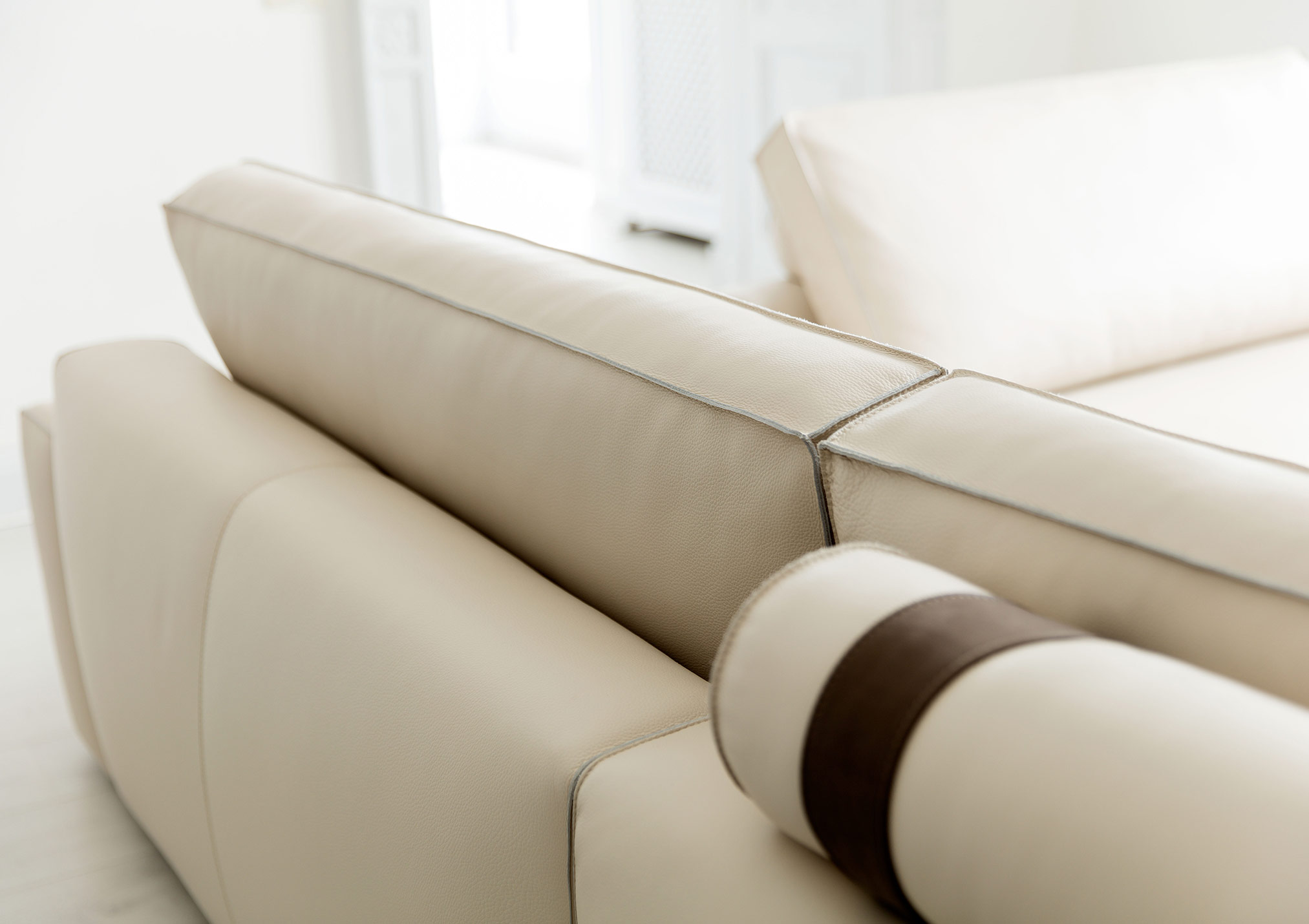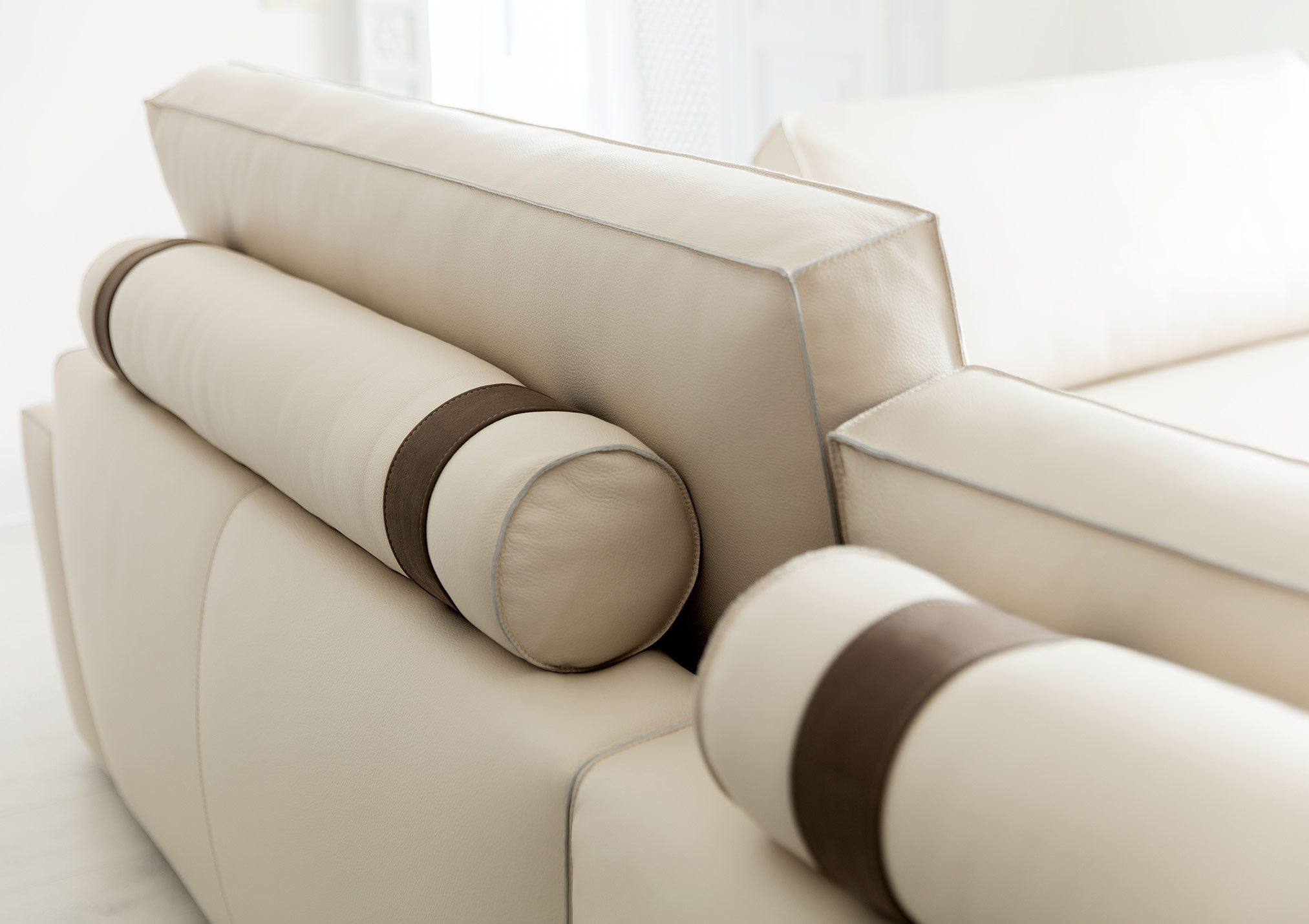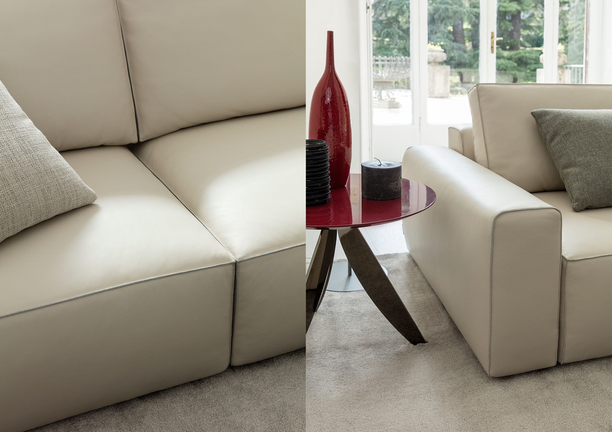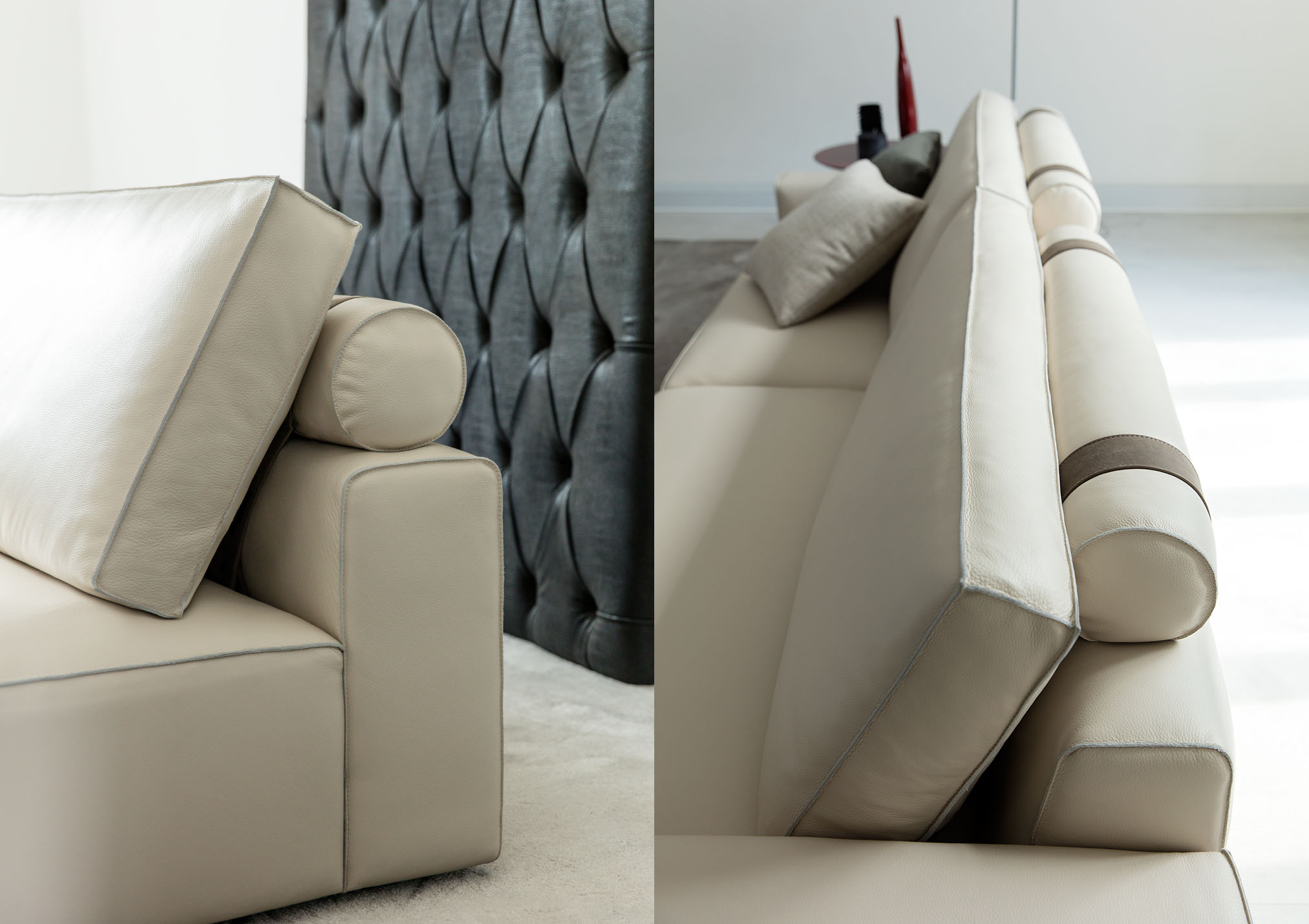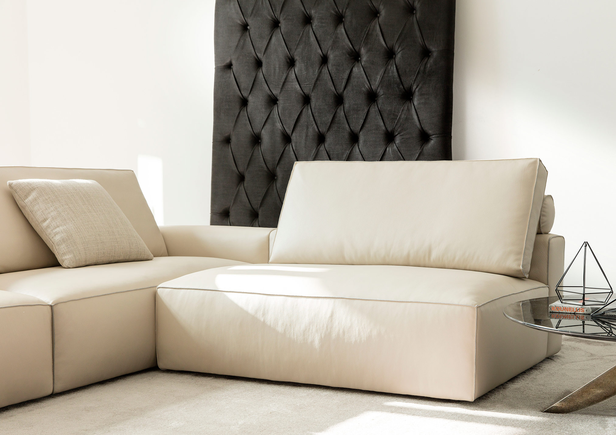 The perfect combination of traditional upholstery and high technology in our sofa Johnny with leather chaise longue.