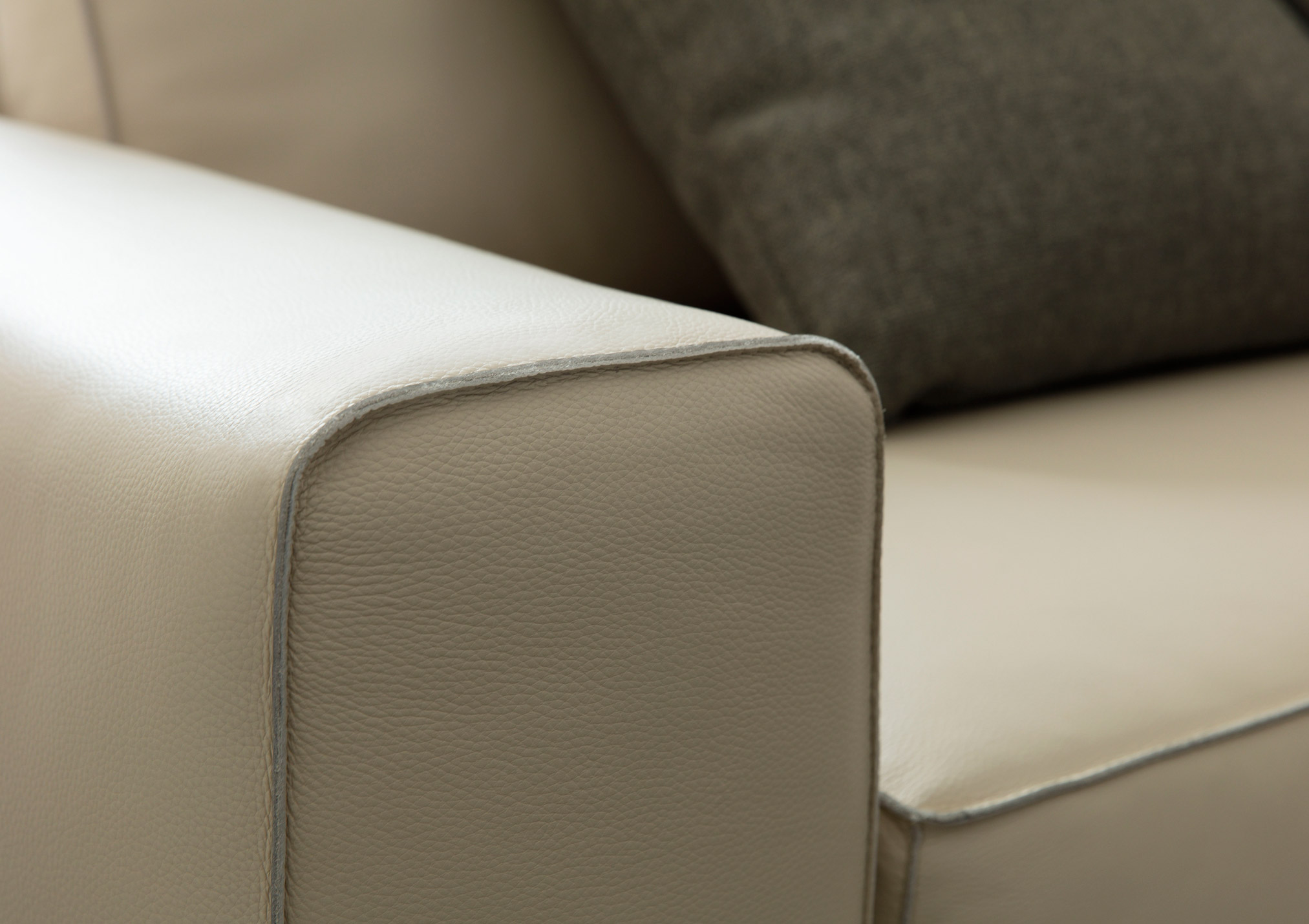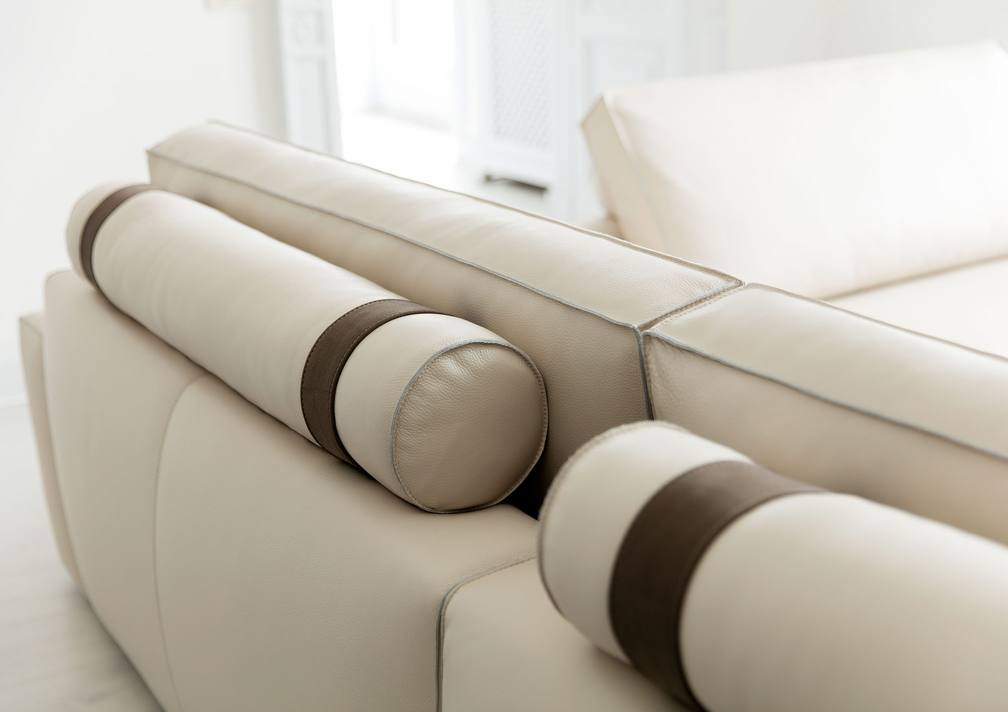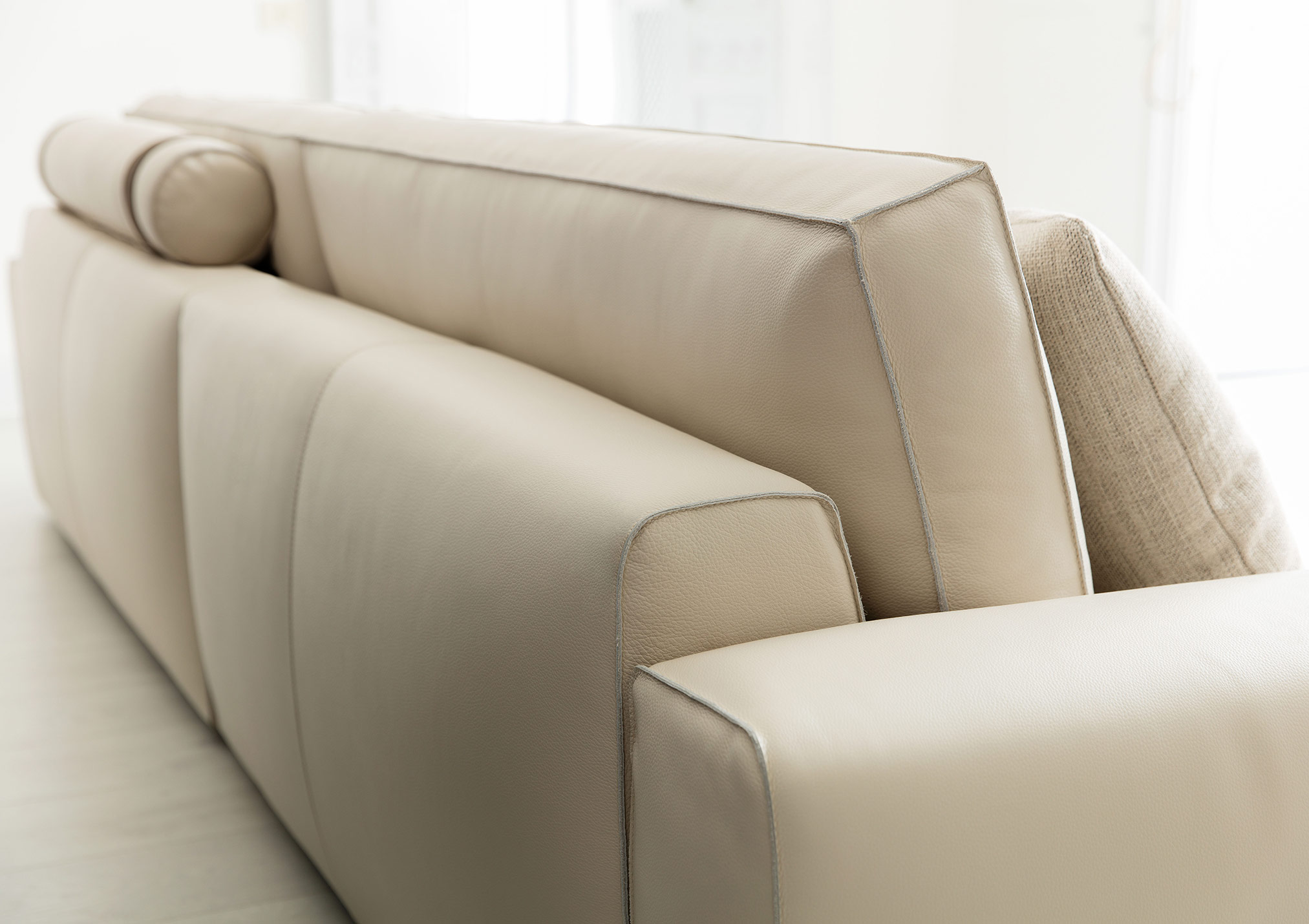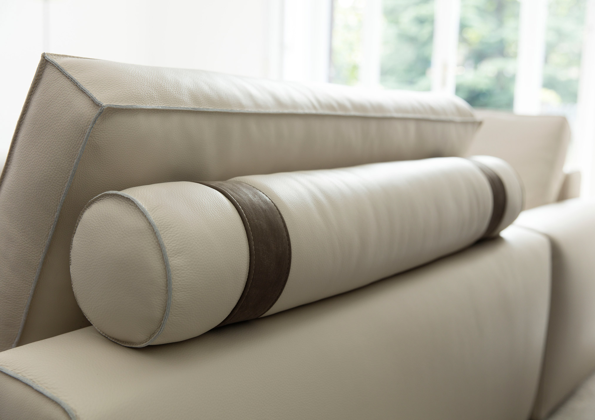 The perfect combination of traditional upholstery and high technology in our sofa Johnny with leather chaise longue.